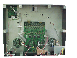 Inside the reader. The data board is in the center. The two round boards are motor drivers. An operator panel is in the upper left corner. |