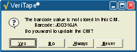 The bar code can be copied into the Cartridge Memory. If a bar code is already stored in the CM it is compared to the bar code label and a warning is displayed in case of a mismatch. |
