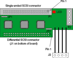 single-ended SCSI bus connector. J1, on the bottom of the board, is